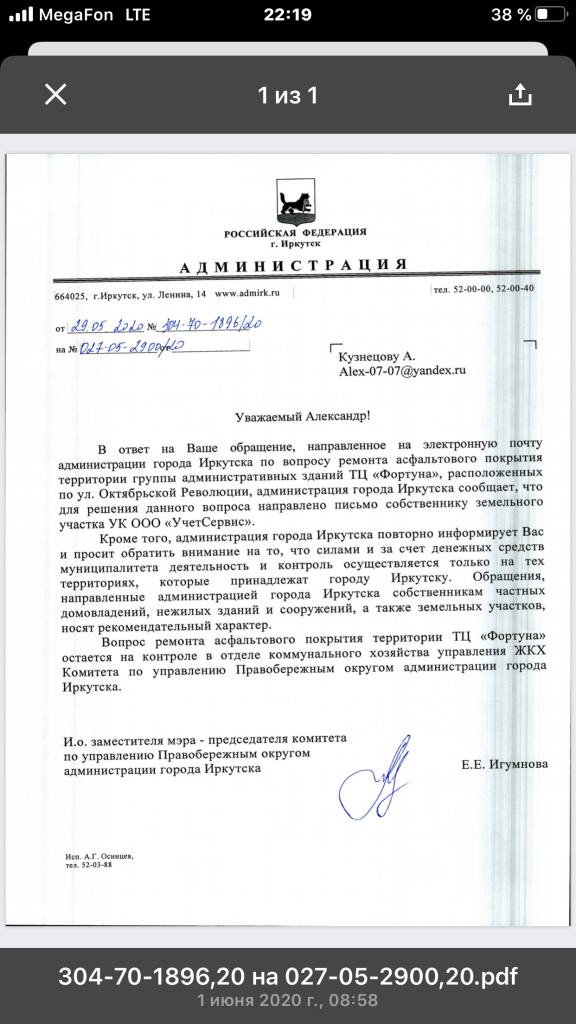 Прошу обратить внимание на территорию асфальта вокруг трц Фортуна. Каждый год одно и то же. Администрация г.Иркутска со своей стороны не может повлиять на этот беспредел. Подъездные пути и территория вся разбита.