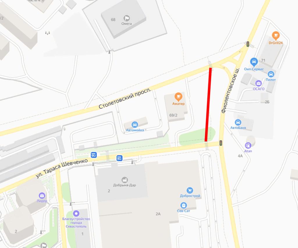В Департамент транспорта. Между пешеходными переходами на Столетовском проспекте и ул. Тараса Шевченко отсутствует тротуар рядом со Столетовским проспектом 69/2. Это важная пешеходная дорога, ведущая к крупному торговому центру "Добрострой". Приходится идти по грунтовой дороге. Прошу заасфальтировать. Выделил на схеме красным цветом.