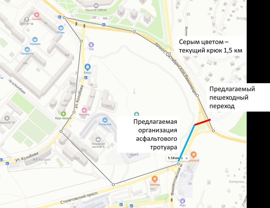 Прошу организовать пешеходный переход в районе Октябрьской площади (автомобильная развязка пр. Октябрьской революции, Фиолентовского шоссе и ул. Красивая). Дороги в этом месте достаточно прямые, проблем с зоной видимости для автомобилистов наблюдаться не должны (можно перенести на плюс минус 50 метров). Данный пешеходный переход позволит пешеходам не делать большой крюк длиной 1,5 км при перемещении от данной точки до 5-го микрорайона, Столетовского проспекта и окрестных мест (показал на карте), что сейчас очень неудобно. Также обустройство данного перехода повысит доступность крупного гипермаркета "Добрострой".