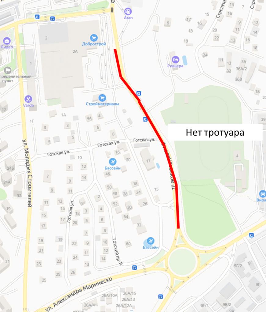 Между Готским проездом, 15 и Фиолентовским шоссе, 2А отсутствует тротуар со стороны ул. Готская. При этом даже по грунтовой дороге стало сложно проходить после ремонта коммуникаций. Это приводит к значительным трудностям для пешеходов. Эта дорога приводит к значительным неудобствам для пешеходов, пытающихся пройти до крупного торгового центра "Добрострой". На этой дороге также имеется остановка общественного транспорта, что говорит о значимости обустройства данного места. Прошу организовать тротуар.