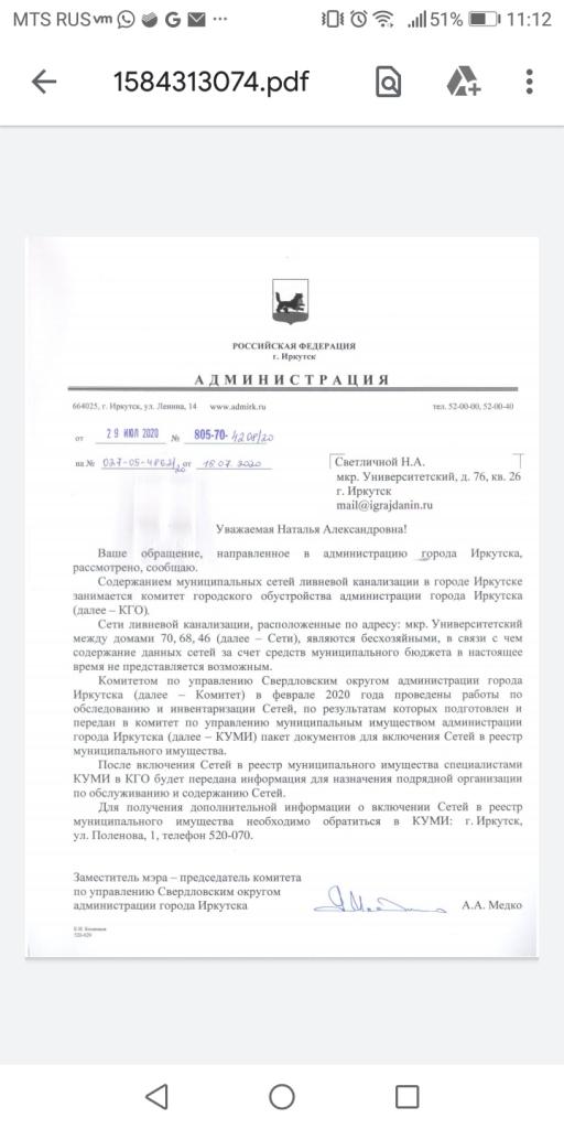Наталья СветличнаяЕщё один ответ пришёл на Эл почту. Прикрепляю. Это о чем? Какая Канализация в Университетском? На какой запрос?