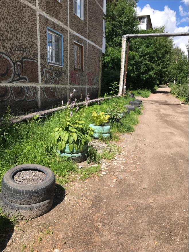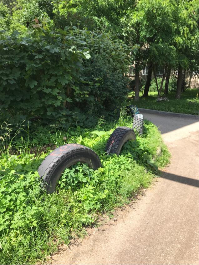 Прошу убрать с зелёной зоны возле дома 7 по улице Румянцева старые покрышки ( на фото)