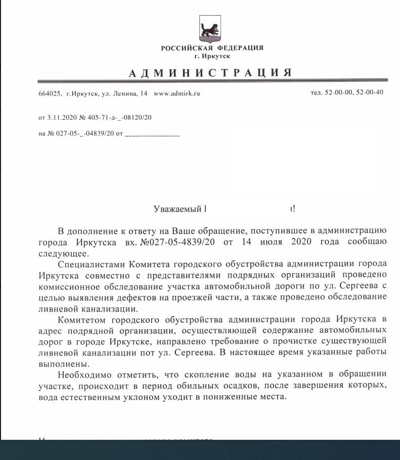 айГражданинОтправлено 14.09.2020: "Администрация города Иркутска"