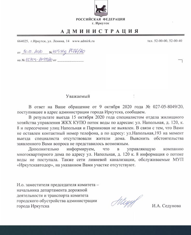 айГражданинОтправлено 07.10.2020: "Администрация города Иркутска"
