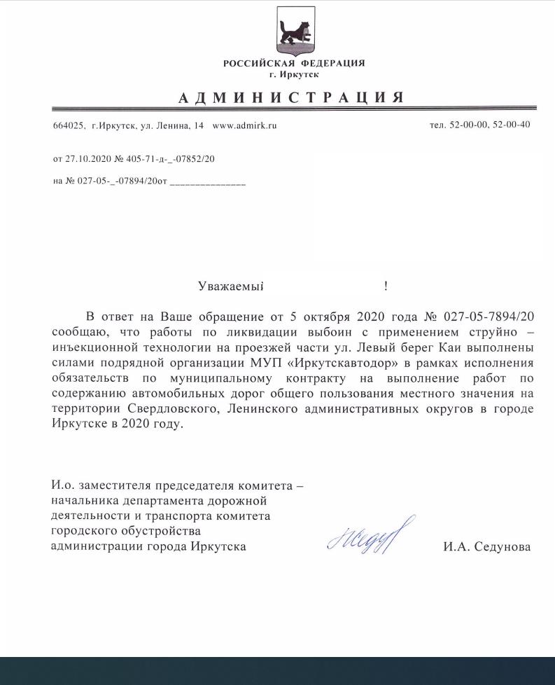 айГражданинОтправлено 02.10.2020: "Администрация города Иркутска"