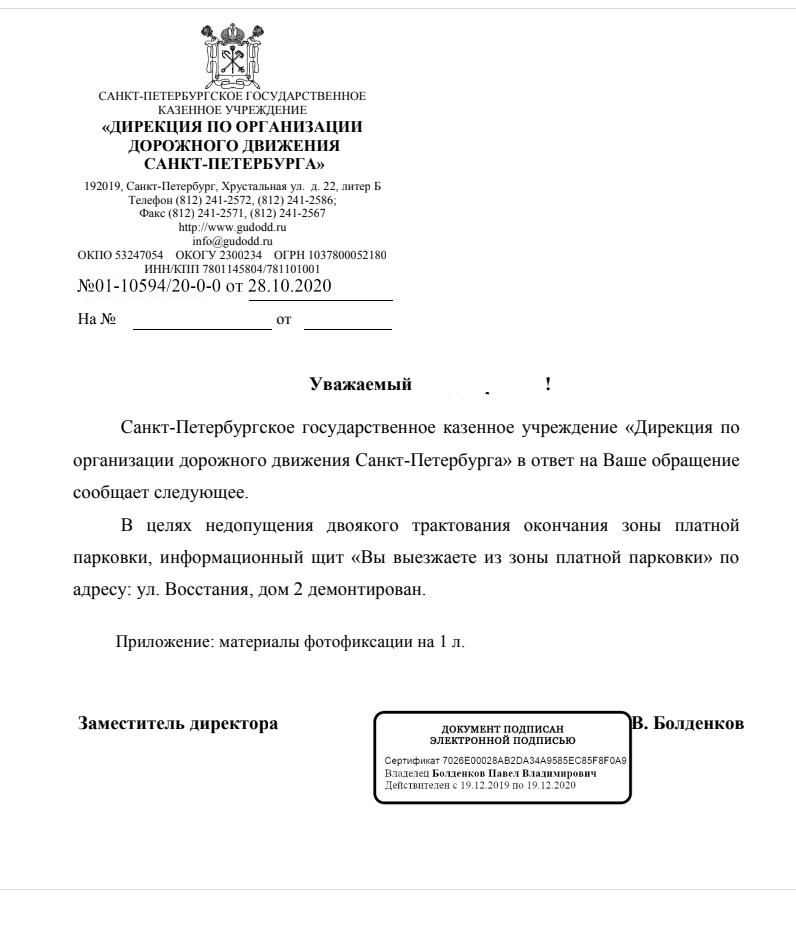 айГражданинОтправлено 05.10.2020: "Дирекция по организации дорожного движения Санкт-Петербурга"