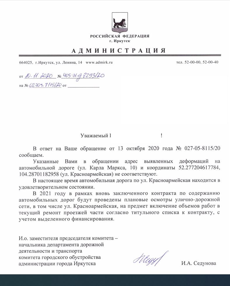 айГражданинОтправлено 11.10.2020: "Администрация города Иркутска"