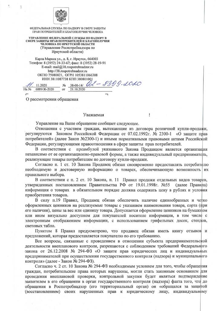айГражданинОтправлено 21.10.2020: "Управление Роспотребнадзора по Иркутской области"