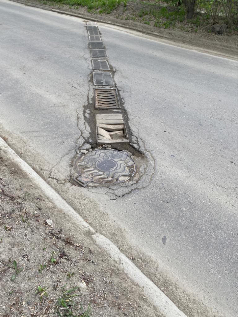 между Фаворского и Лермонтова. Демонтированы и не восстановлены решётки приямков (лотка), провалился канализационный колодец . Фото прилагается. Данное обращение направляется повторно, на первое обращение администрации ответила, что данный проблема не существует, поэтому повторно направляю вам фотографии проблемного участка
