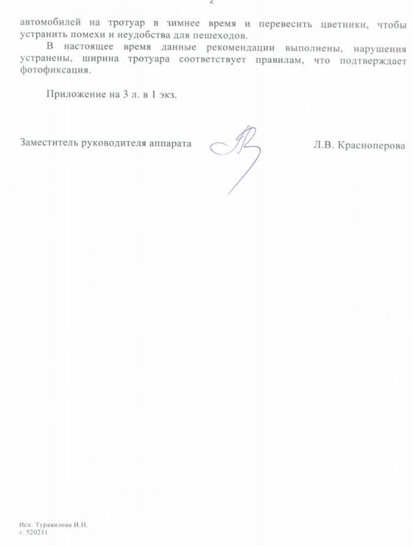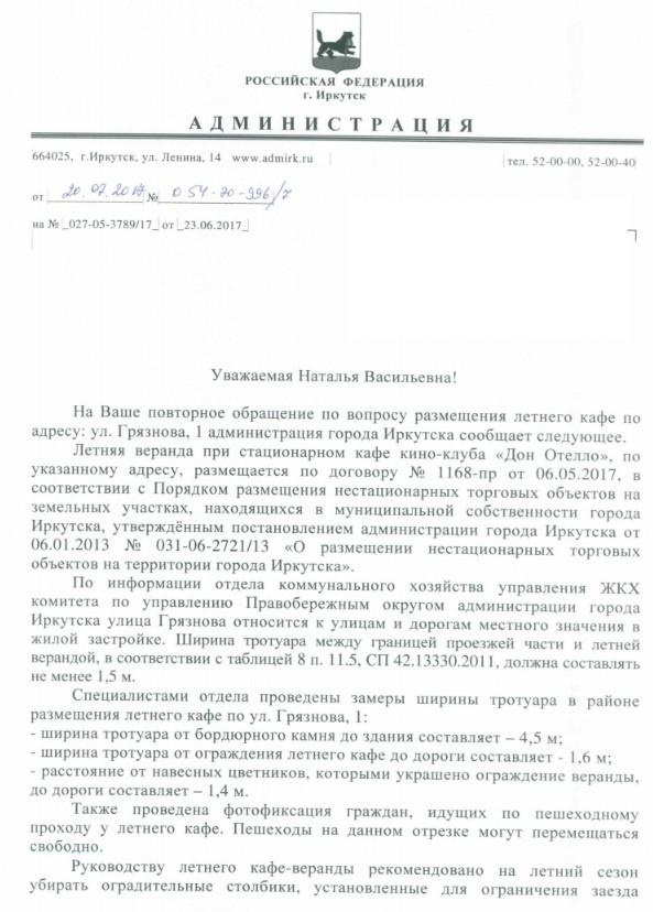 В ответ на ваше письмо от 13.06.2017 № 180-70-733/7 отвечаю, что ваш ответ, написанный исполнителем, фактически - отписка, ответ не по существу. А понятие, указанное администрацией в ответе как "летнее кафе не создает помех" - субъективное, что не соответствует ответу такого уровня как муниципалитет. Поэтому пишу повторное обращение и прошу ответить на все мои вопросы и принять меры, необходимые для ликвидации помехи на тротуаре.