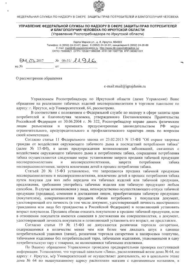 айГражданинОтправлено 23.06.2017: "Управление Роспотребнадзора по Иркутской области"