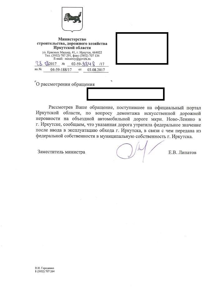 айГражданинОтправлено 02.08.2017: "Министерство строительства, дорожного хозяйства Иркутской области"