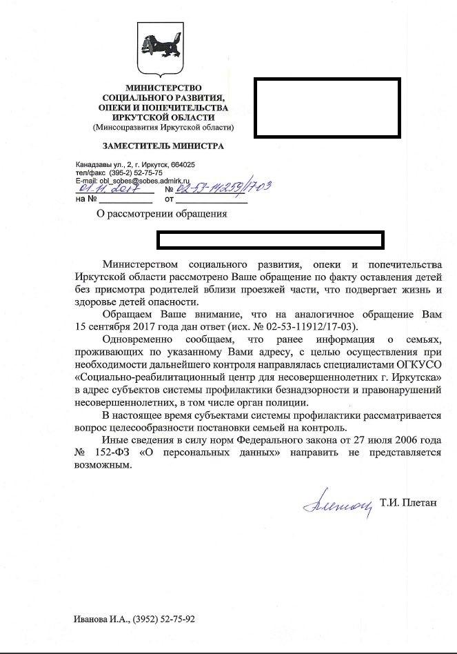 айГражданинОтправлено 04.10.2017: "Министерство социального развития, опеки и попечительства Иркутской области"