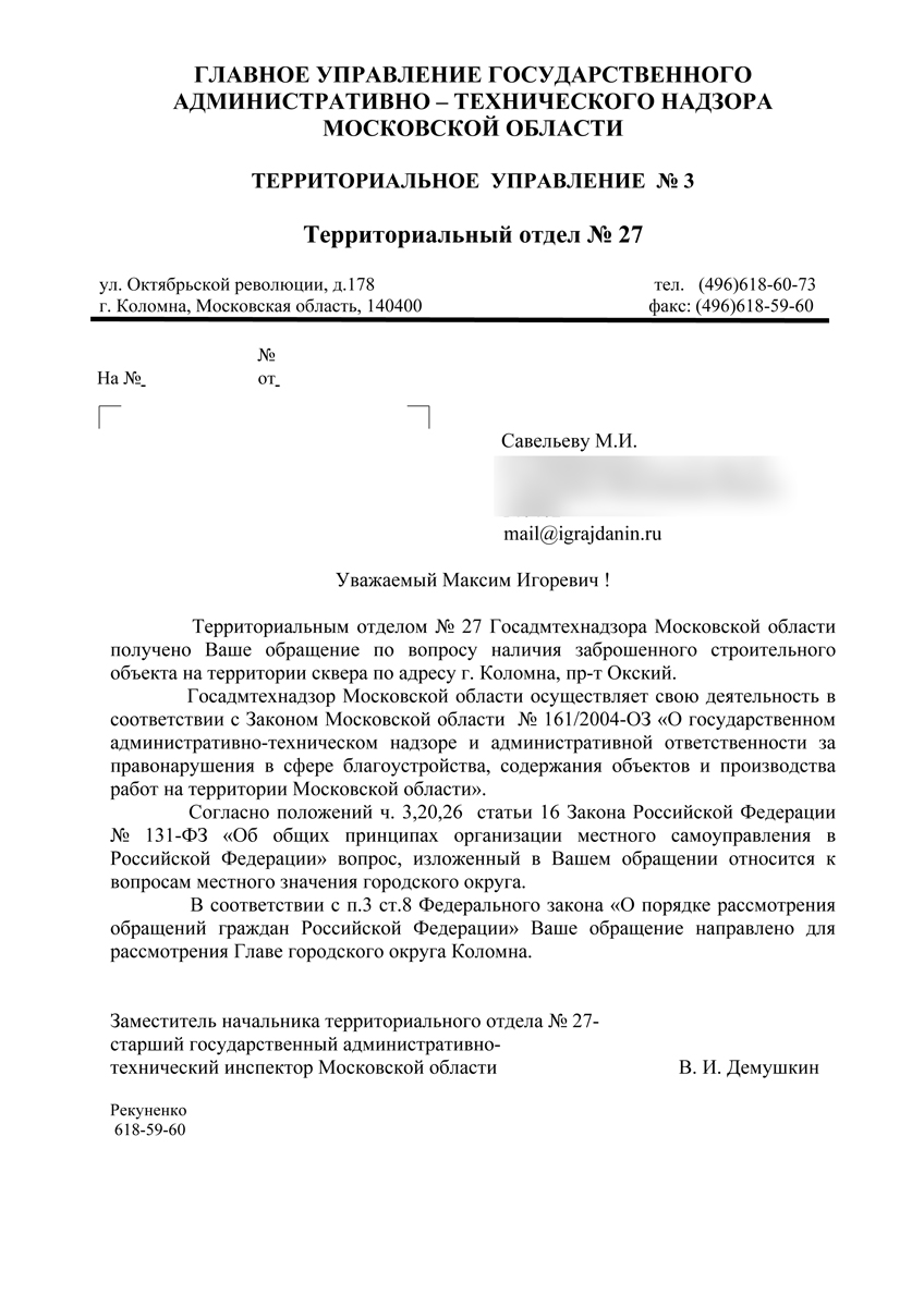 айГражданинПолучен официальный ответ от Государственного административно-технического надзора МО, Территориальный отдел № 27 г.Коломна по данной проблеме: