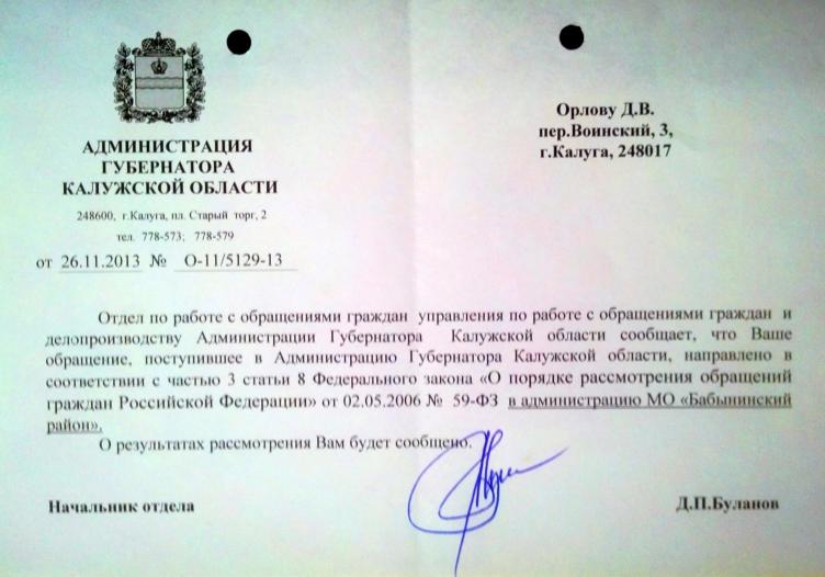 айГражданинОтправлено 25.11.2013: "Администрация Калужской области", "Администрация МР Бабынинский район Калужской области"