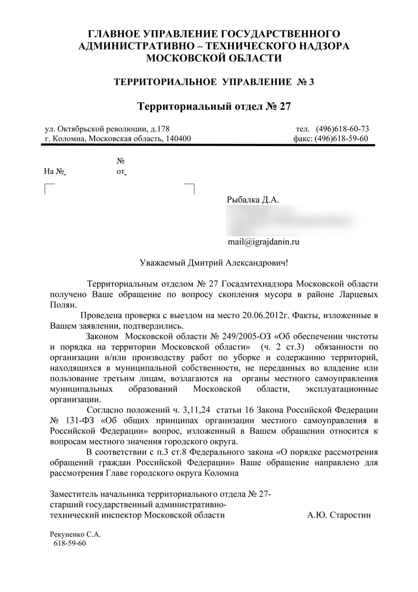айГражданинПолучен официальный ответ от Государственного административно-технического надзора МО, Территориальный отдел № 27 г.Коломна по данной проблеме: