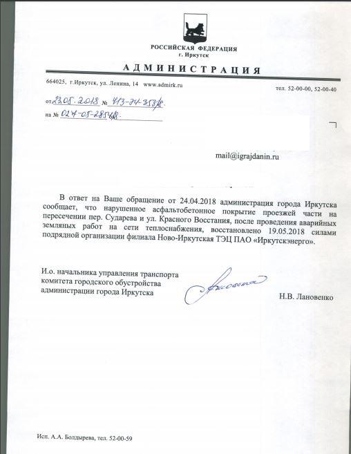 айГражданинОтправлено 24.04.2018: "Администрация города Иркутска"