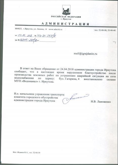 айГражданинОтправлено 24.04.2018: "Администрация города Иркутска"