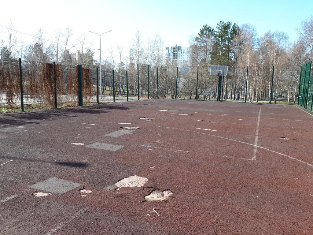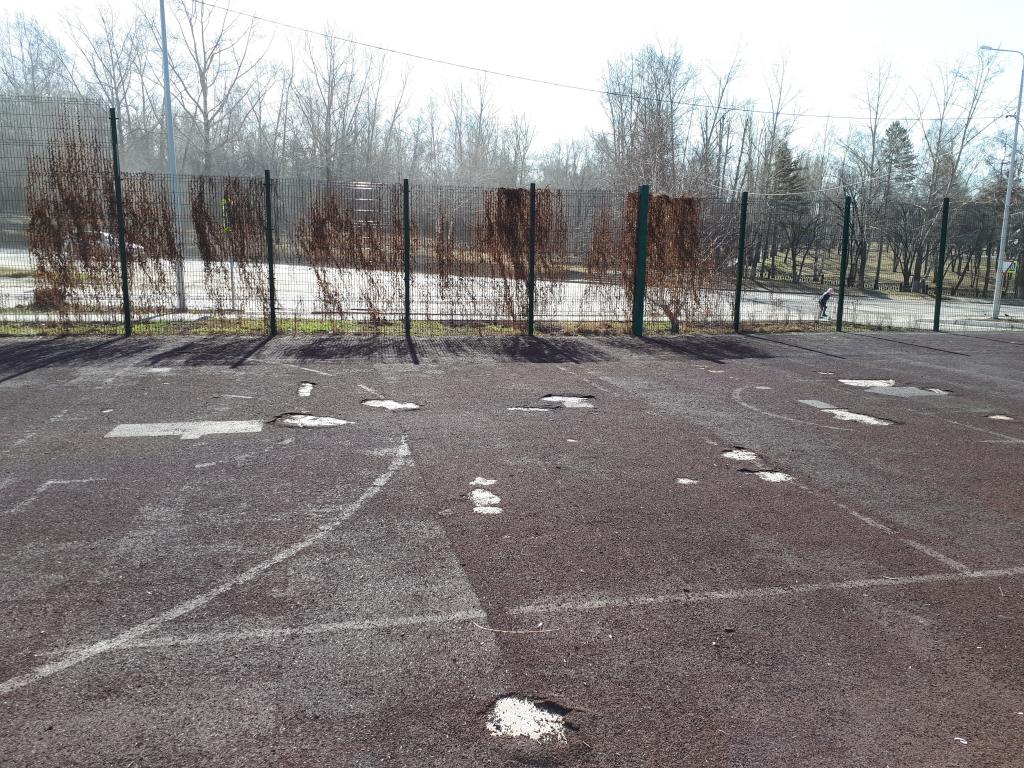 Покрытие спортивной площадки имеет множество повреждений (на фото), вся площадка покрыта мелкой резиновой крошкой от разрушающегося покрытия. По причине этого занимающиеся спортом систематически травмируются. Требуется замена покрытия.