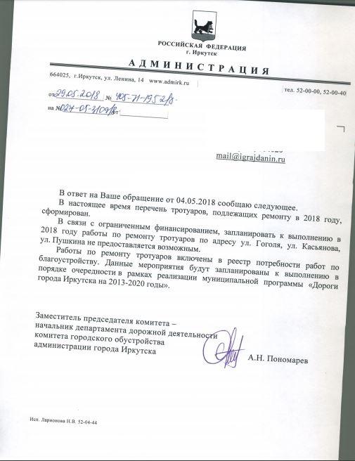 айГражданинОтправлено 04.05.2018: "Администрация города Иркутска"