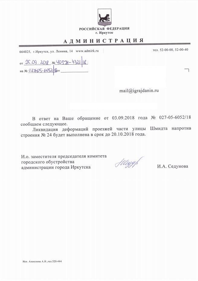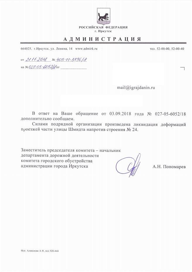 айГражданинОтправлено 02.11.2018: "Администрация города Иркутска"