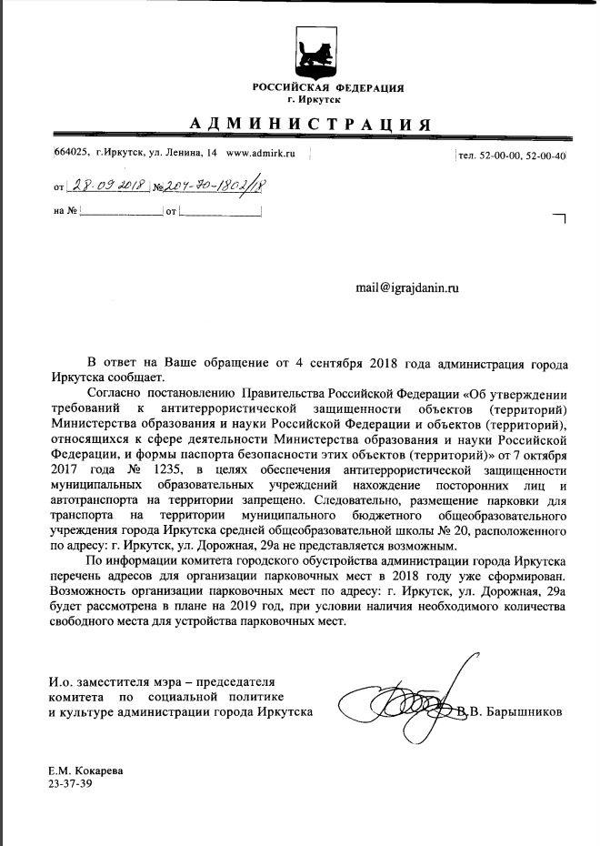 айГражданинОтправлено 04.09.2018: "Администрация города Иркутска"