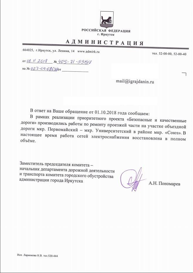 айГражданинОтправлено 01.10.2018: "Администрация города Иркутска"