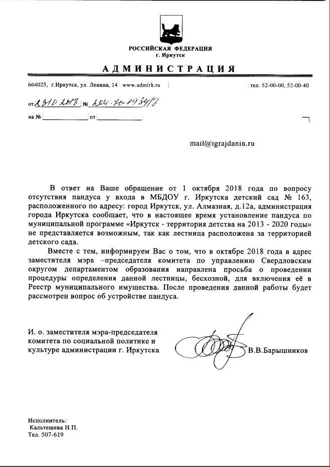 айГражданинОтправлено 01.10.2018: "Администрация города Иркутска"