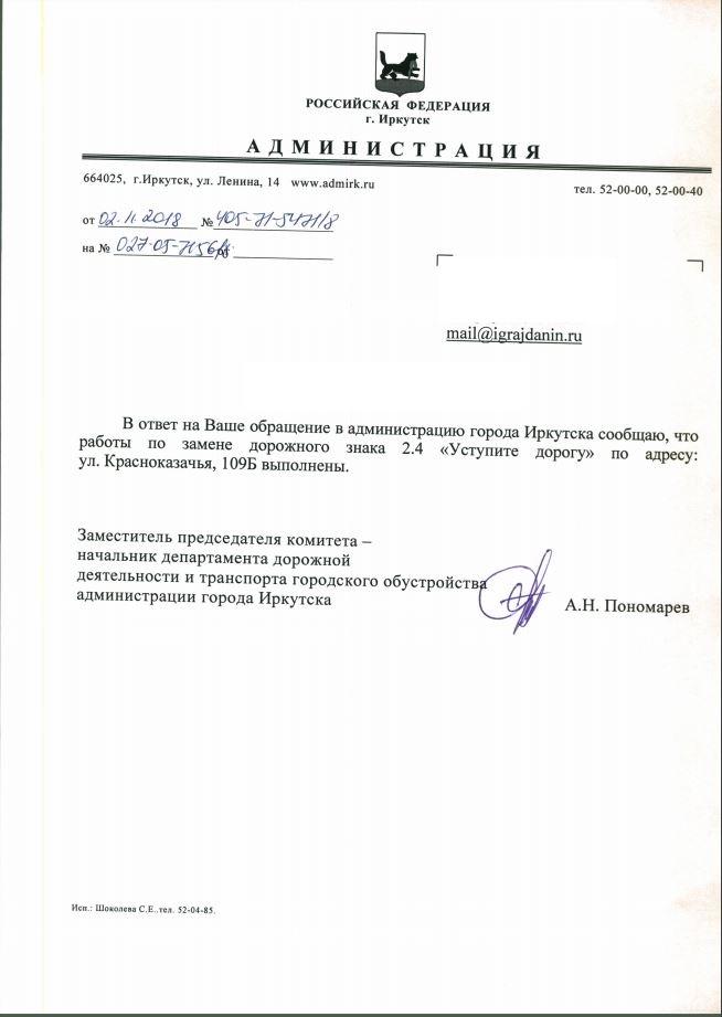 айГражданинОтправлено 11.10.2018: "Администрация города Иркутска"