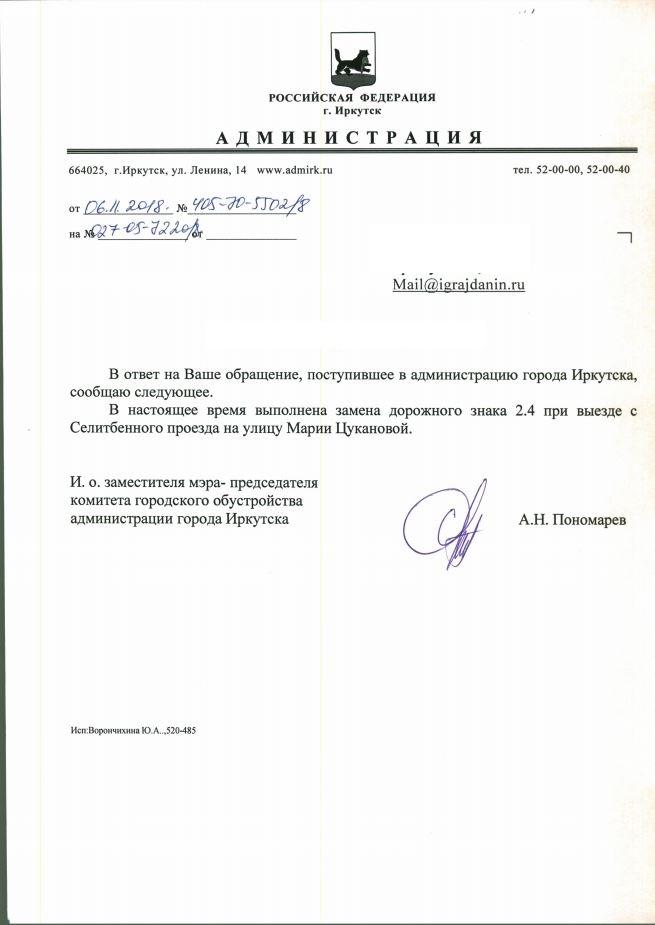 Отправлено 15.10.2018: "Администрация города Иркутска"
