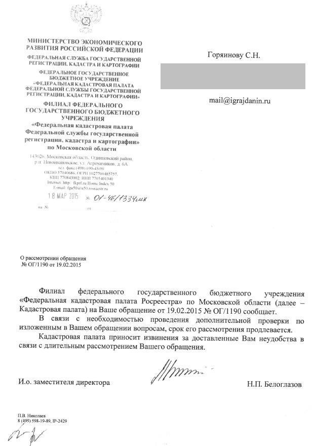 айГражданинПолучен ответ от филиала ФГБУ «Федеральная кадастровая палата Росреестра» по Московской области.