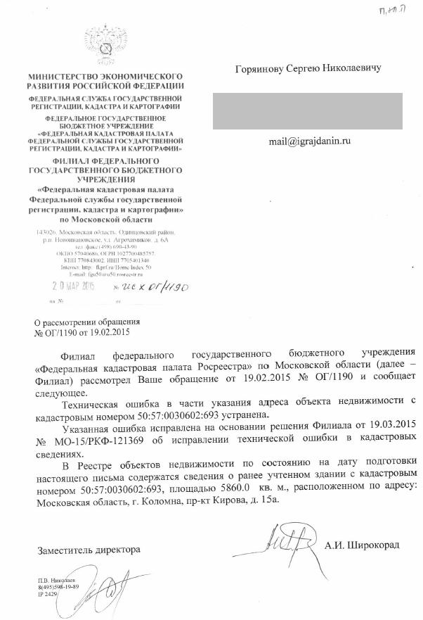 айГражданинПроблема закрыта. Согласно ответу филиала ФГБУ «Федеральная кадастровая палата Росреестра» по Московской области. Техническая ошибка в части указания адреса объекта недвижимости устранена.