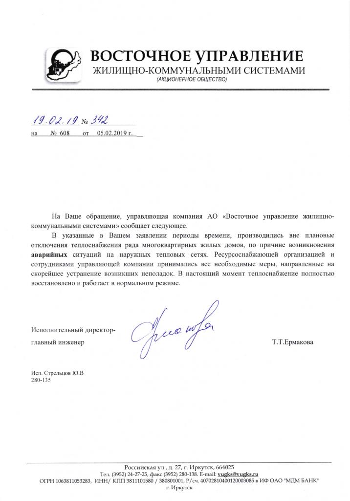 айГражданинОтправлено 04.02.2019: "УК "Восточное управление жилищно-коммунальными системами" г. Иркутск "
