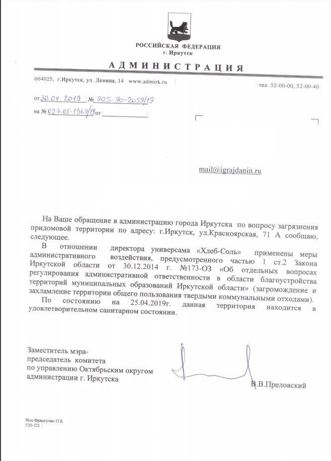 айГражданинОтправлено 09.04.2019: "Администрация города Иркутска"