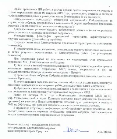 Для реализации данной проблемы могу написать заявление, собрать подписи жильцов. Известна позиция председателя ТСЖ - лучше газон для собачек или забор от собачек, чем детская площадка для детей, на которой будут собираться хулиганы. Аргумент "за" - щит с предупреждением о штрафе и возрасте пребывания людей на площадке, объективно полиция дежурит с этой целью на площадках, объективно на площадках у других домов хулиганов не наблюдалось, объективно площадка нужна тем, кто не может видеть другие площадки из окон для детей постарше, лет 11, например, объективно вид веселее будет, когда будет хотя бы один грибок с песком для маленьких детей и качеля - на той части газона. где жильцам дома больше всего покажется больше всего нужной. На данный момент мое предложение председатель ТСЖ расценивает как мелкособственническое. Возражаю - детям, по истечении карантина, было бы хорошо на солнечной стороне гулять в период с 16 до 20, рядом с домом, да и мамам и бабушкам - лавочки были бы полезны. Во дворе именно нашего дома нет ни одной лавочки из страха перед хулиганами - ни присесть ни внутри двора, ни на солнечной стороне. Так как я столкнулась с противодействием, может быть, нужно это сделать как-то на другом уровне. Как думаете?