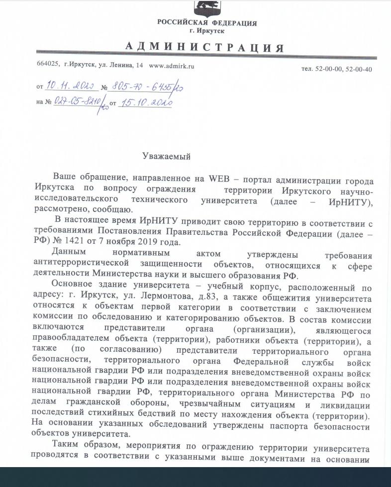 айГражданинОтправлено 12.10.2020: "Администрация города Иркутска"