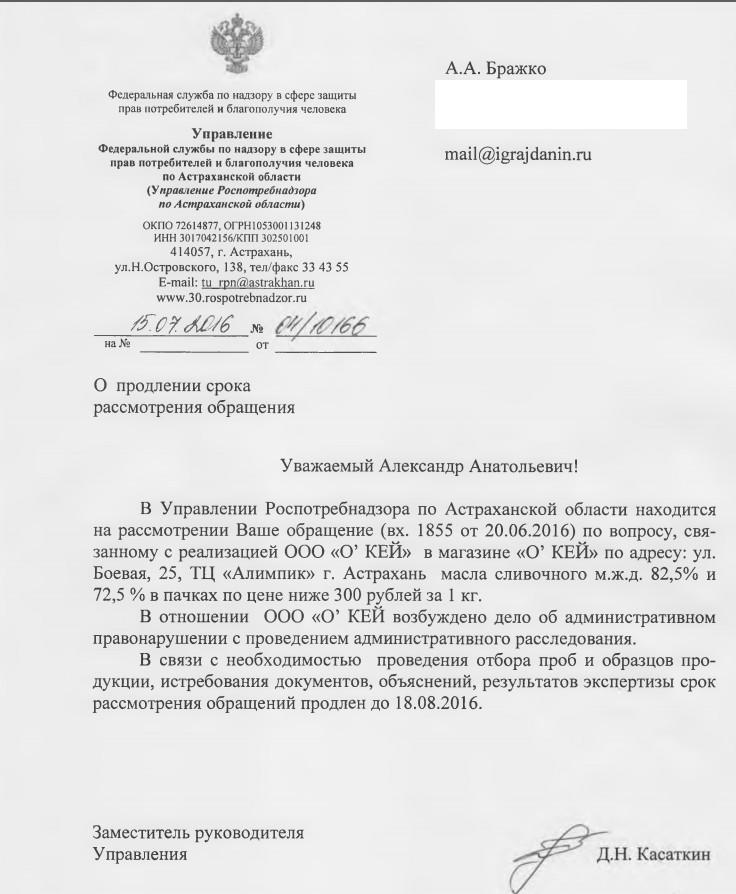 Отправлено 17.06.2016: "Управление Федеральной службы по надзору в сфере защиты прав потребителей и благополучия человека по Астраханской области"