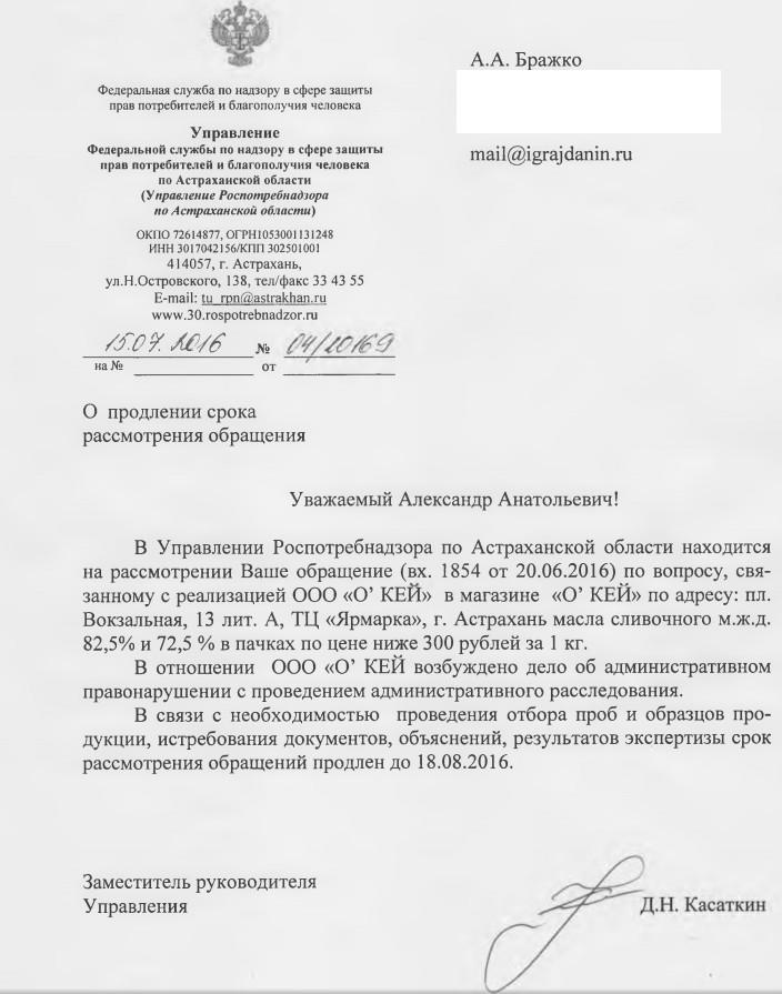Отправлено 17.06.2016: "Управление Федеральной службы по надзору в сфере защиты прав потребителей и благополучия человека по Астраханской области"