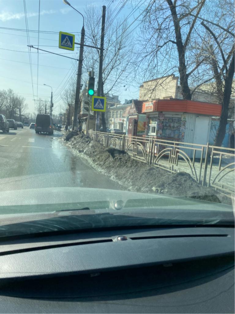 Снег после очистки улицы рабочего штаба хранится на площади дорожного полотна, на тротуарах, на газонах более двух месяцев