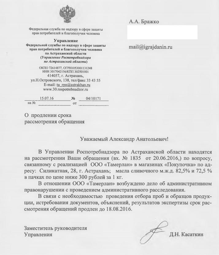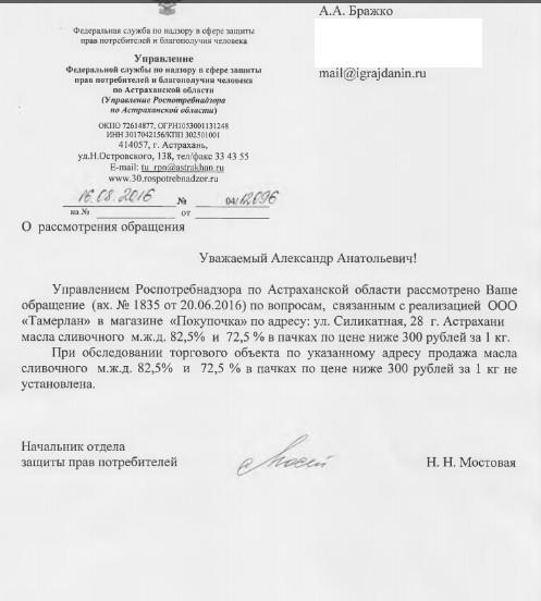 Отправлено 17.06.2016: "Управление Федеральной службы по надзору в сфере защиты прав потребителей и благополучия человека по Астраханской области"