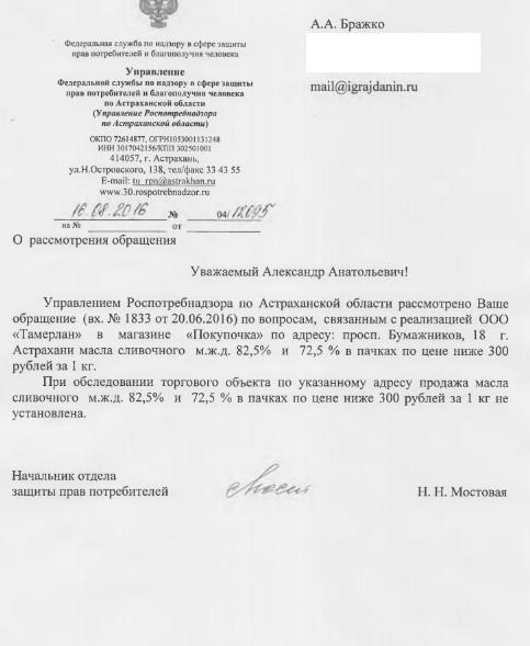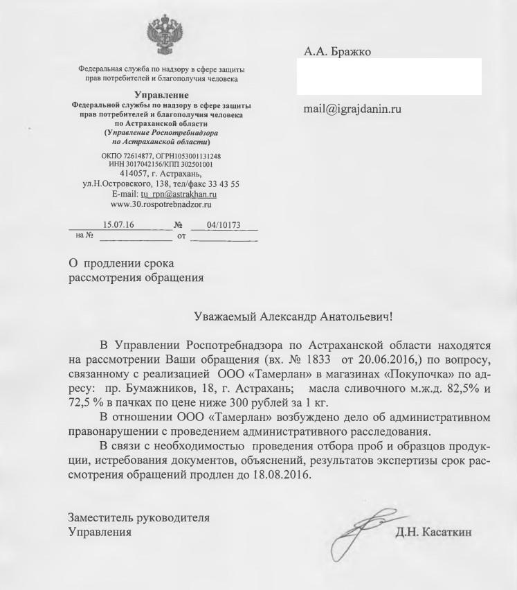 айГражданинОтправлено 17.06.2016: "Управление Федеральной службы по надзору в сфере защиты прав потребителей и благополучия человека по Астраханской области"