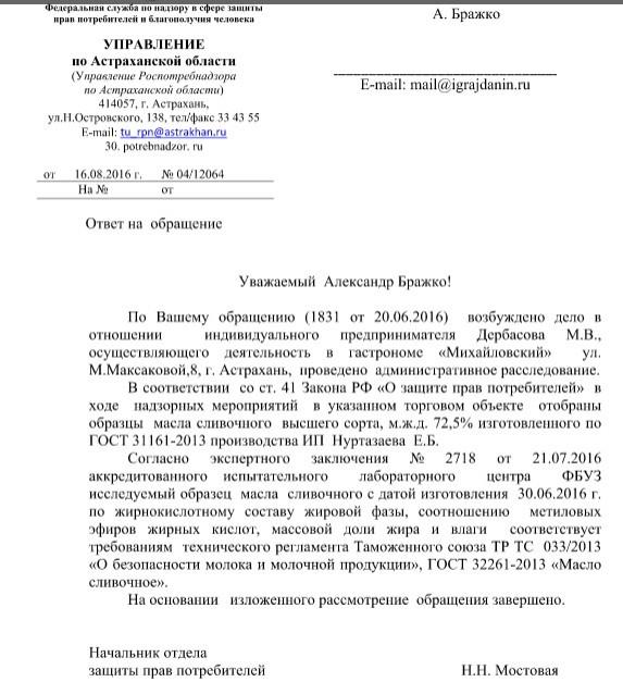 айГражданинОтправлено 17.06.2016: "Управление Федеральной службы по надзору в сфере защиты прав потребителей и благополучия человека по Астраханской области"