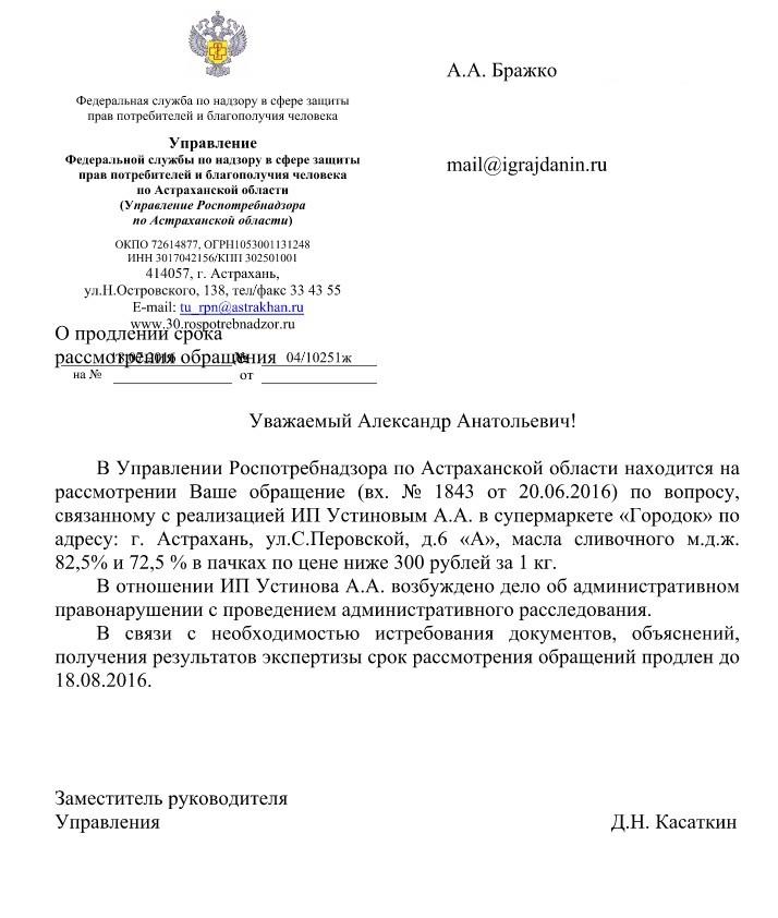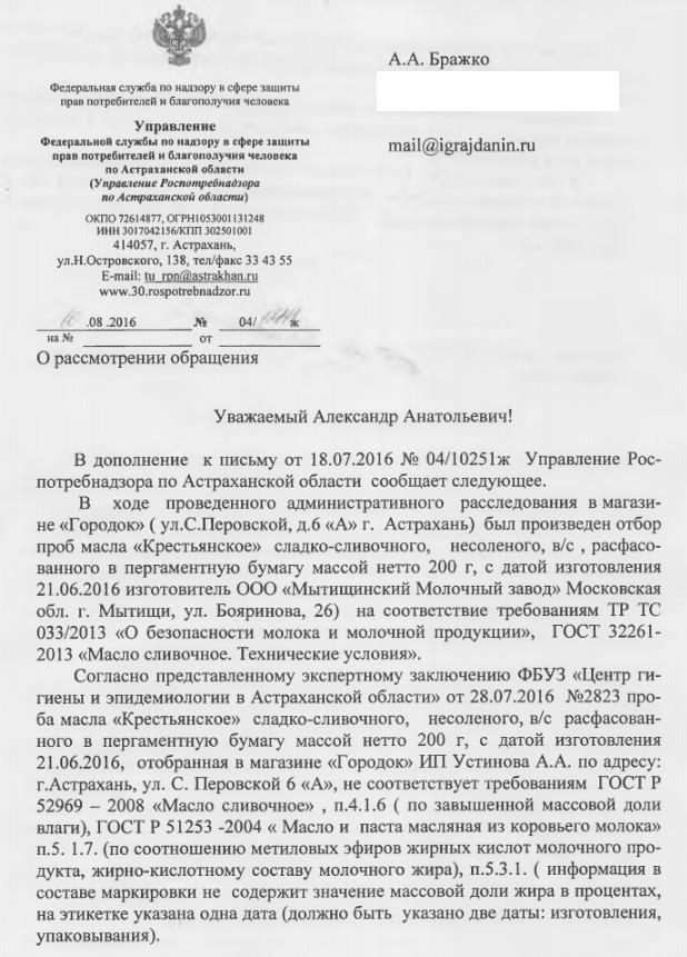 Отправлено 17.06.2016: "Управление Федеральной службы по надзору в сфере защиты прав потребителей и благополучия человека по Астраханской области"