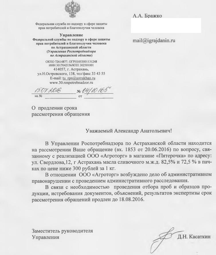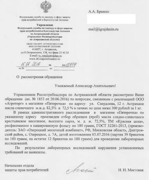 Отправлено 17.06.2016: "Управление Федеральной службы по надзору в сфере защиты прав потребителей и благополучия человека по Астраханской области"