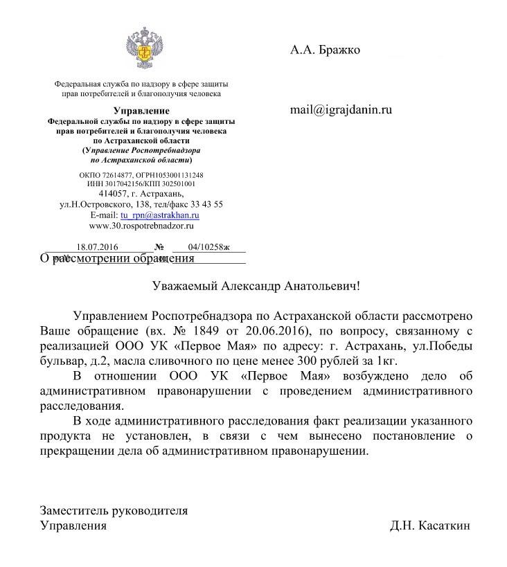 айГражданинОтправлено 17.06.2016: "Управление Федеральной службы по надзору в сфере защиты прав потребителей и благополучия человека по Астраханской области"