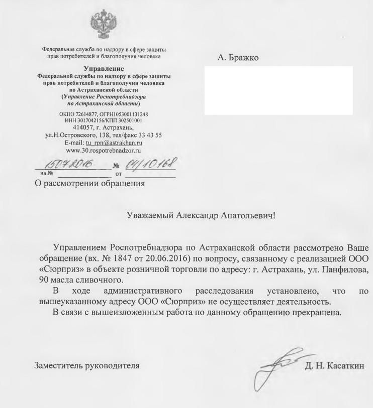 айГражданинОтправлено 17.06.2016: "Управление Федеральной службы по надзору в сфере защиты прав потребителей и благополучия человека по Астраханской области"