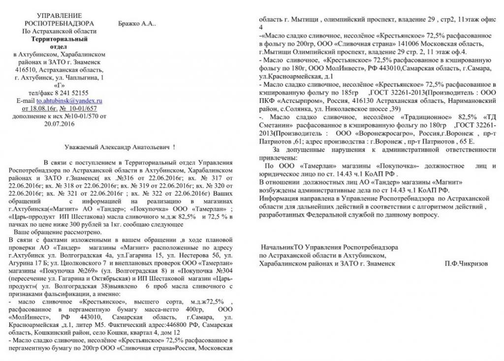 Розничная цена реализации масла является подозрительной, т.к. по аналогичным ценам реализуется фальсифицированная продукция, ранее выявленная Роспотребнадзором России (http://zpp.rospotrebnadzor.ru/badproducts/violations).
