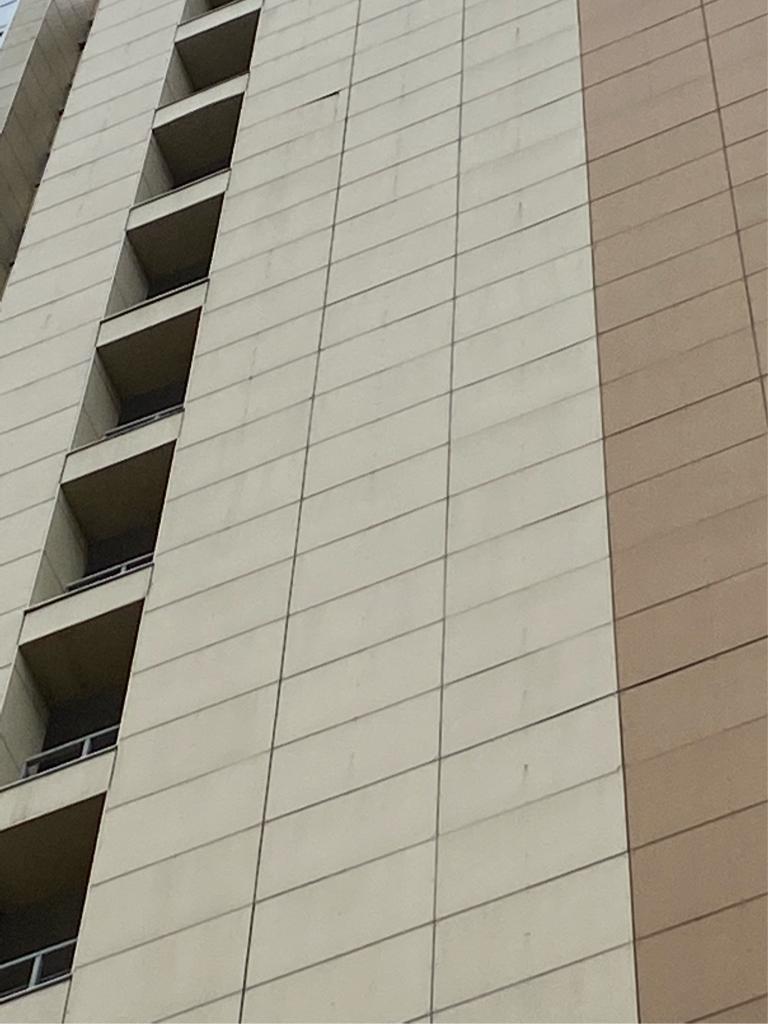 Повреждение фасада ореентировочно на уровне 8-9 этажей. Разбита фасадная панель (фото в приложении), возможно обрушение на тротуар