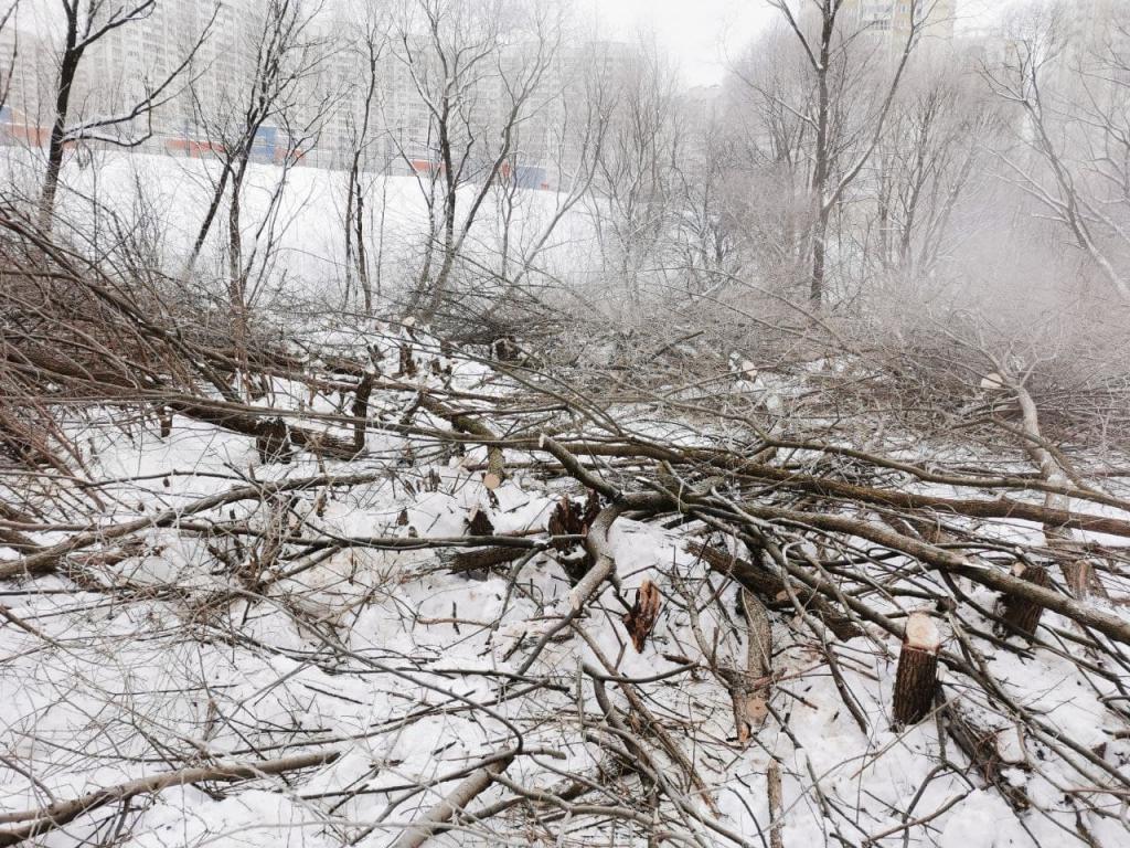 Александр БражкоУничтожение деревьев, растительности, среды обитания птиц на территории ООПТ Природный парк Долина реки Грачевка, г.Химки январь 2022 года