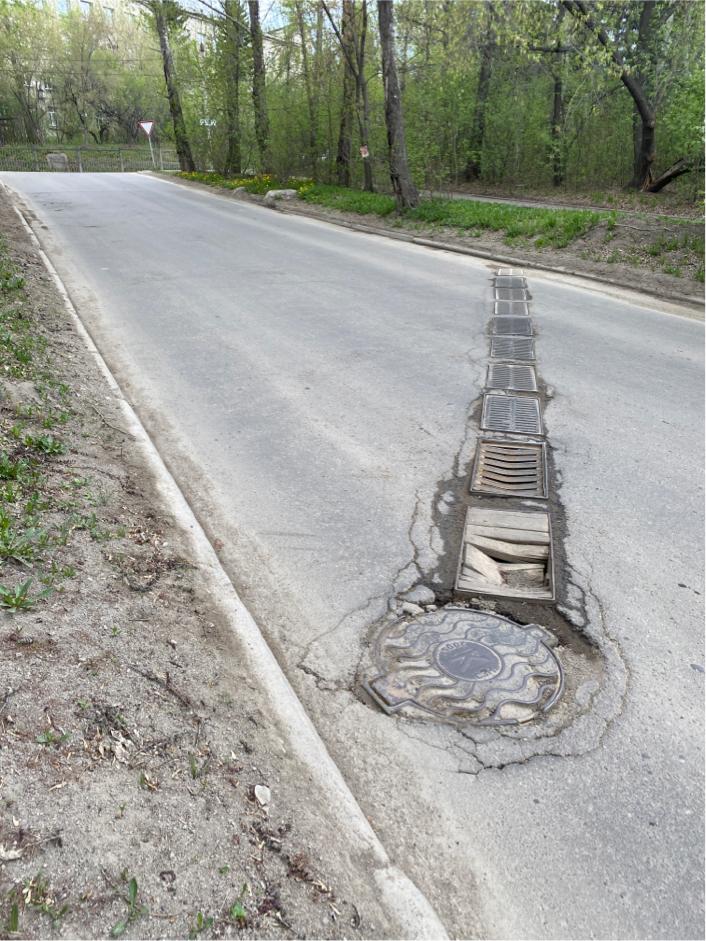 между Фаворского и Лермонтова. Демонтированы и не восстановлены решётки приямков (лотка), провалился канализационный колодец . Фото прилагается. Данное обращение направляется повторно, на первое обращение администрации ответила, что данный проблема не существует, поэтому повторно направляю вам фотографии проблемного участка